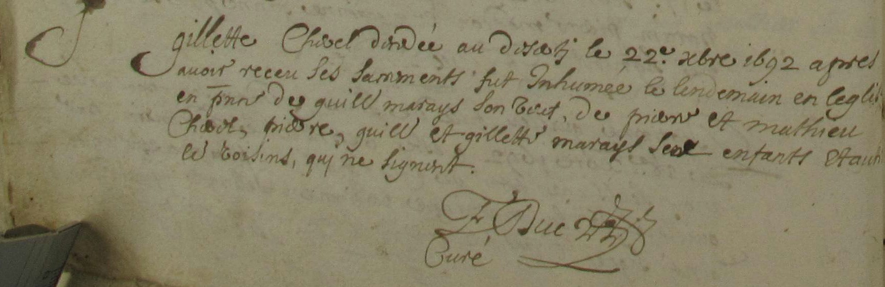 Naissance : avant 1647 à Guichen 35580 Décès : 22 décembre 1692 à Guichen 35580 le Déserti Inhumation : 23 décembre 1692 à Guichen 35580