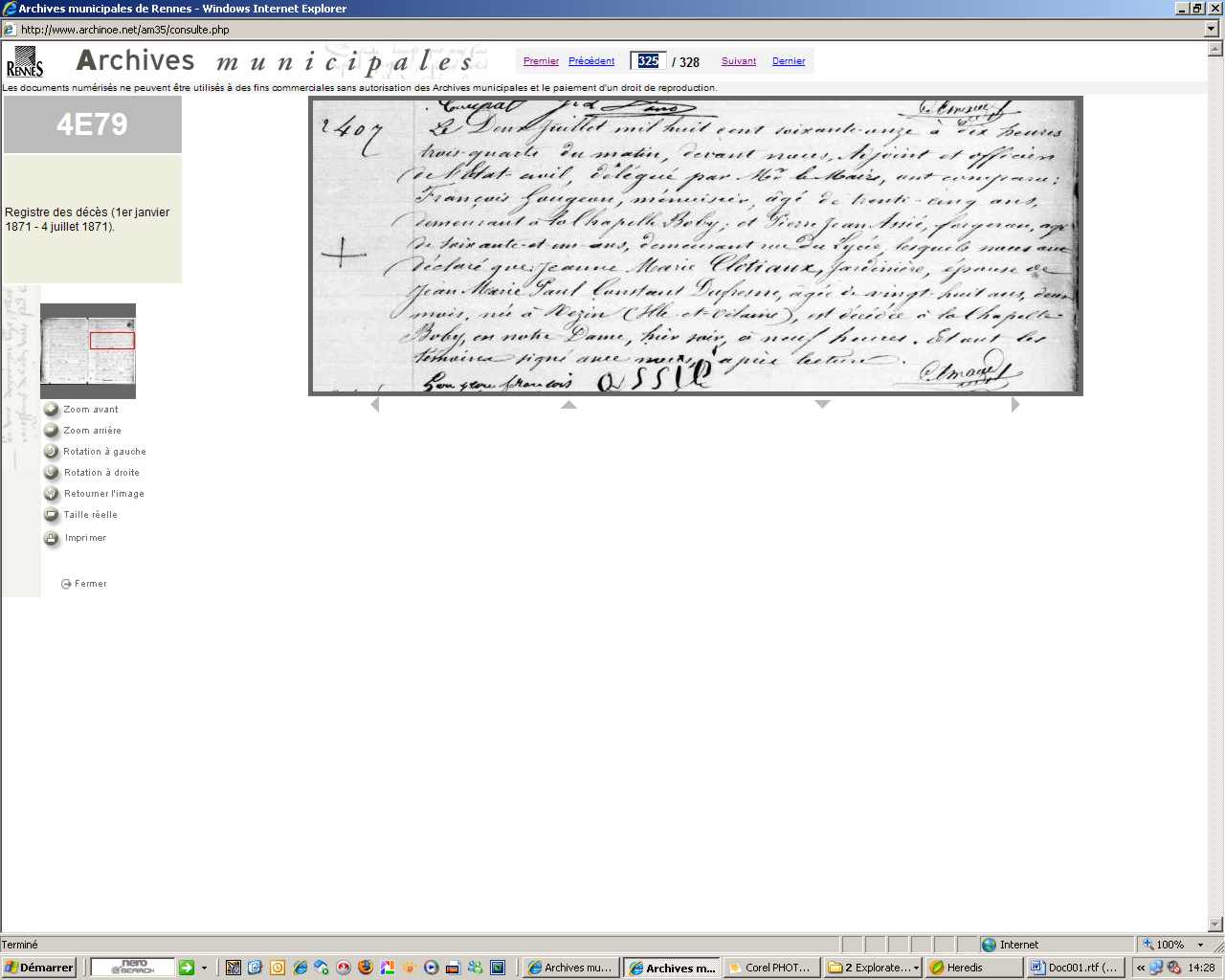 Décès : 1er juillet 1871 à Rennes 35000 La Chapelle Boby en Notre Dame
