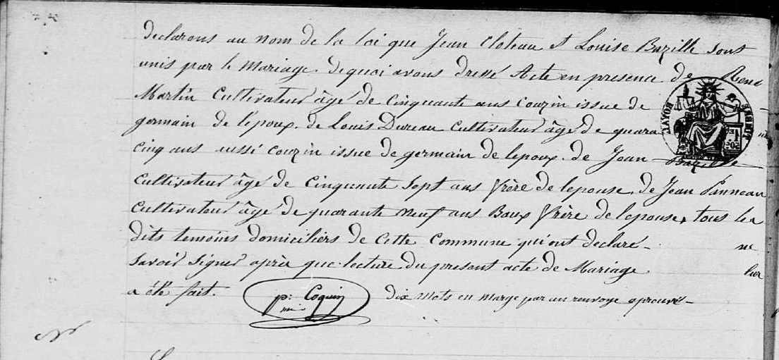 Présents : CLOTEAUX Jean 59 ans beau-frère par alliance laboureur au Bois Louet