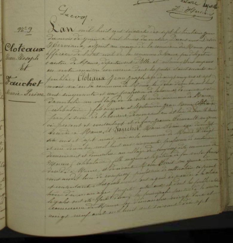 Nom et prénom de la marraine Cloteaux JanneDomicile : 1800 à Guignen 35580 Goulochère Décès : 14 novembre 1820 à Guichen 35580 La Brulonnière
