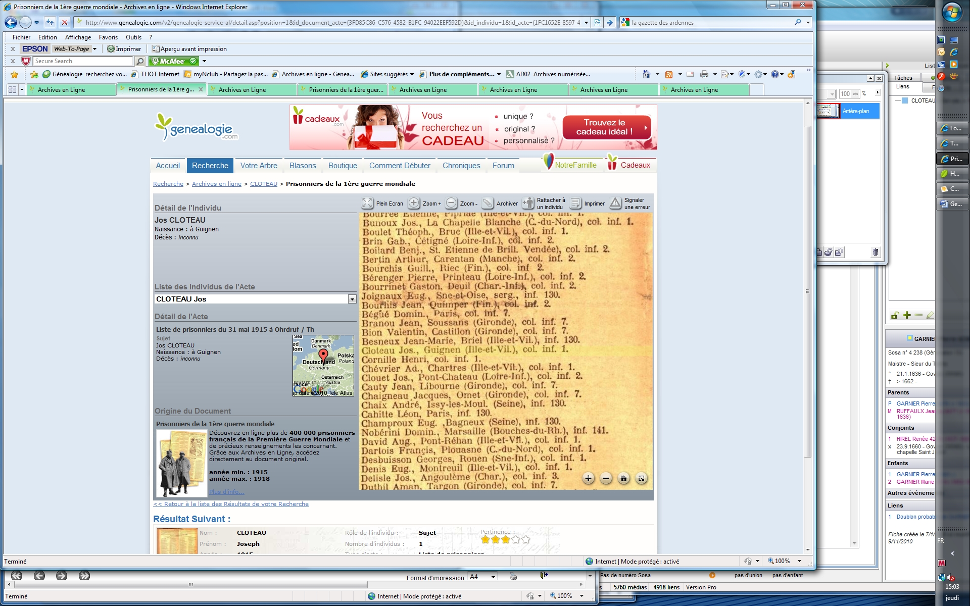 Naissance : avant 1900 à Guignen 35580 Prisonnier de Guerre 14-18 : 31 mai 1915 à Ohrdruf / Th