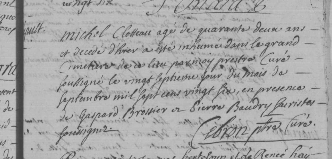 1740 : Témoin au mariage de Vincent CLOTEAU ( CLOTEAUX ) /1719-1750/ et de Toussainte LELIEVRE 1706-1750/Décès : après 1748