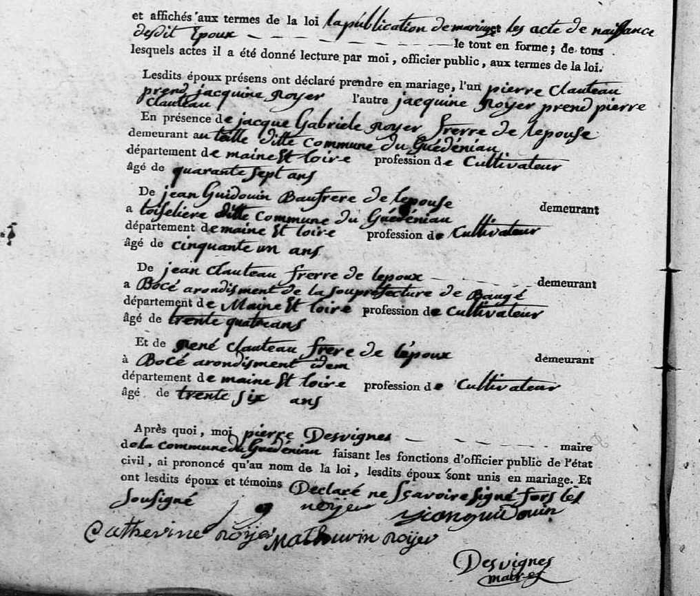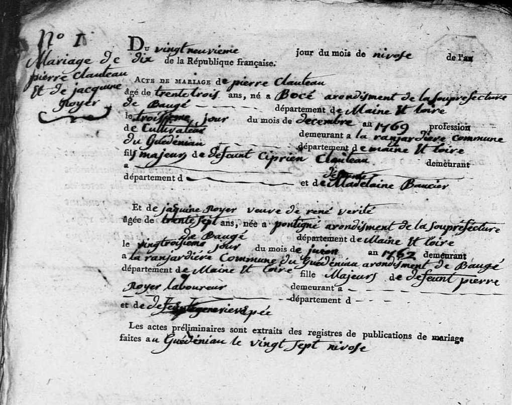 Mariage : 29 nivôse an X à Le Guédéniau 49150