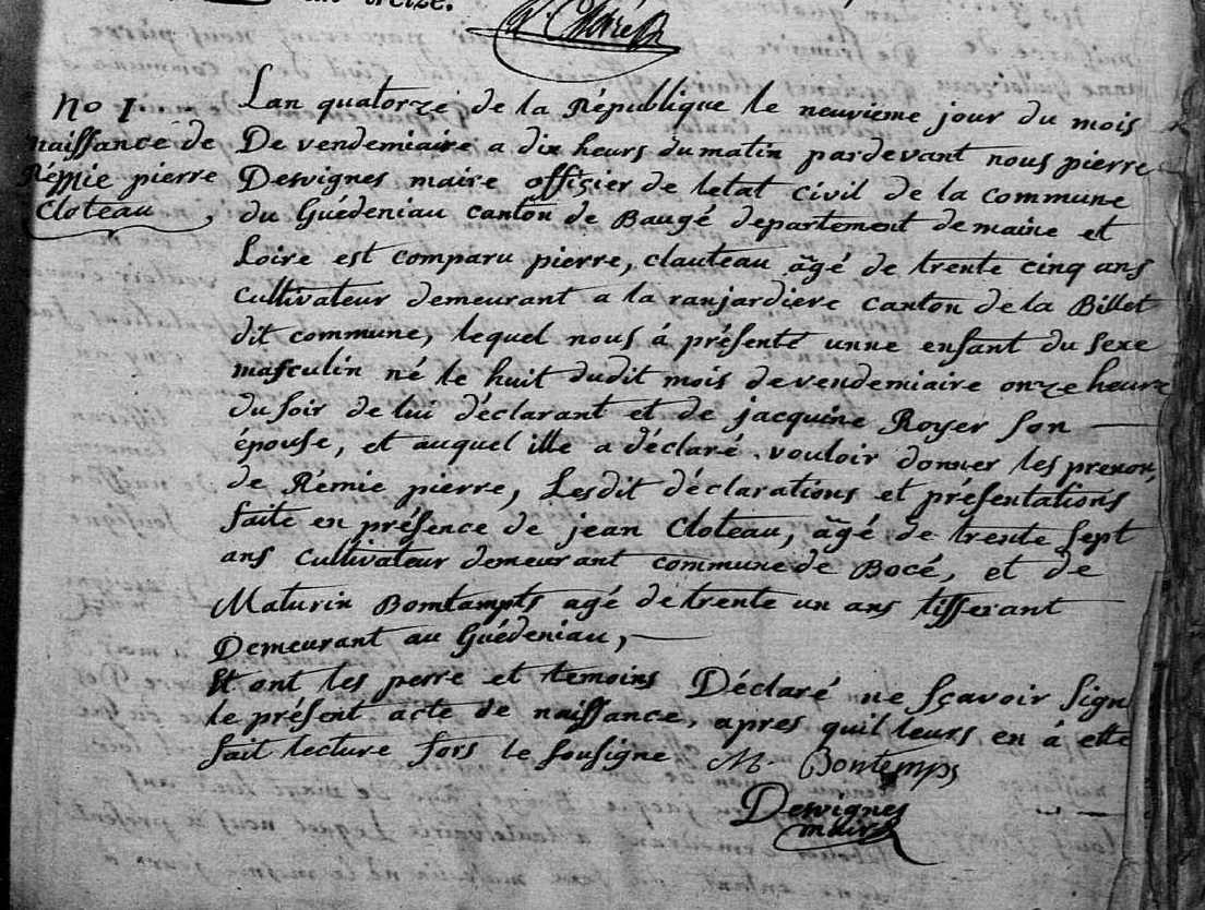 Naissance : 8 vendémiaire an XIV à Le Guédéniau 49150