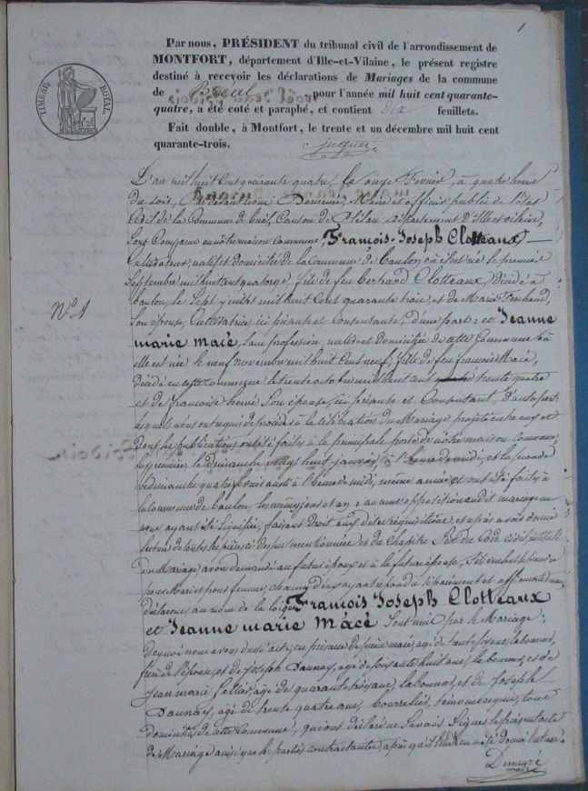 Mariage : 11 février 1844 à Bréal-Sous-Montfort 35310