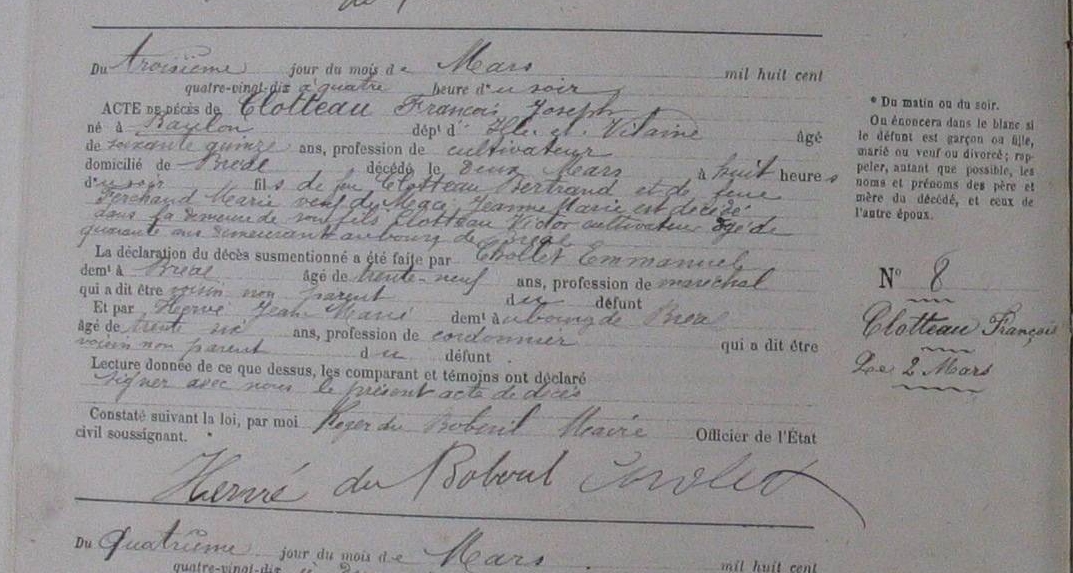 Décès CLOTEAUX François X HEUDIARD 1871 Poligné
