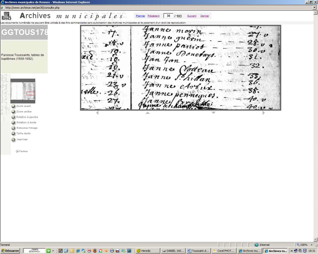 Baptême : 25 juillet 1669 à Rennes 35000 Toussaint