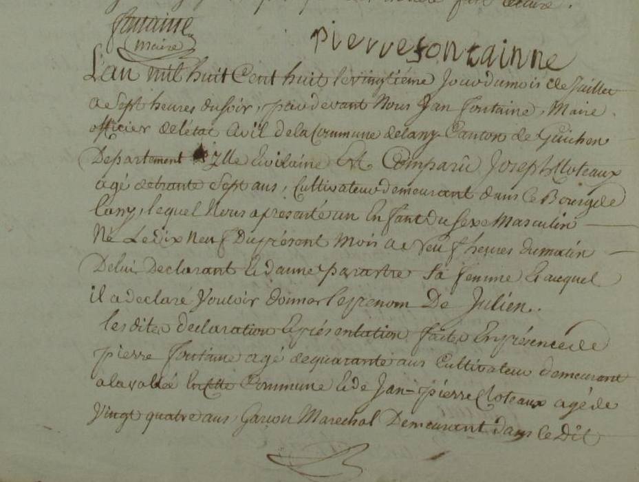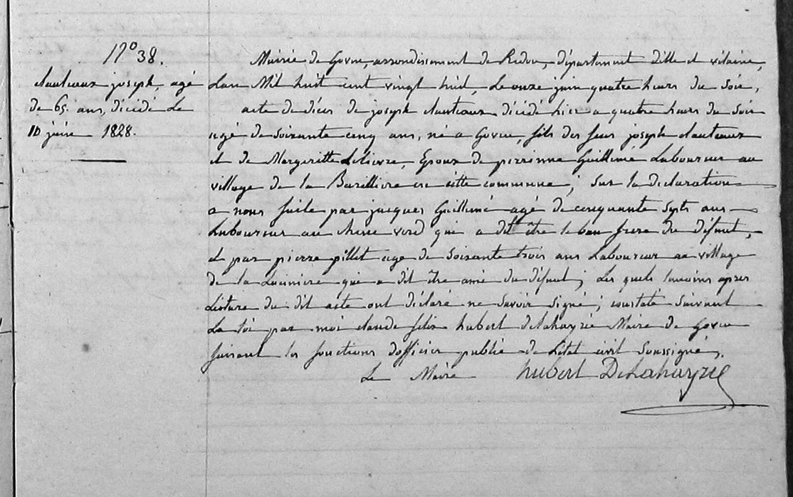 Acte de décès de Joseph Clauteaux décédé hier a quatre heurs du soir, agé de soixante cinq ans, né a Goven fils des feus Joseph Clauteaux et de Marguerite Lelievre, époux de Perrinne Guillemé, laboureur au village de la Barrillière en cette commune ; Sur la déclaration a nous faite par Jacques Guillemé, agé de cinquante sept ans, laboureur au chene vert qui a dit etre le bau frère du défunt, et par Pierre Pillet agé de soixante trois ans laboureur au village de la Lucinière qui a dit etre ami du défunt ; Les quels témoins après lecture du dit acte ont déclaré ne savoir signé, constaté suivant la loi par moi Claude Félix Hubert de Lahayrie Maire de Goven faisant les fonctions d'officier public de l'état civil, soussigné