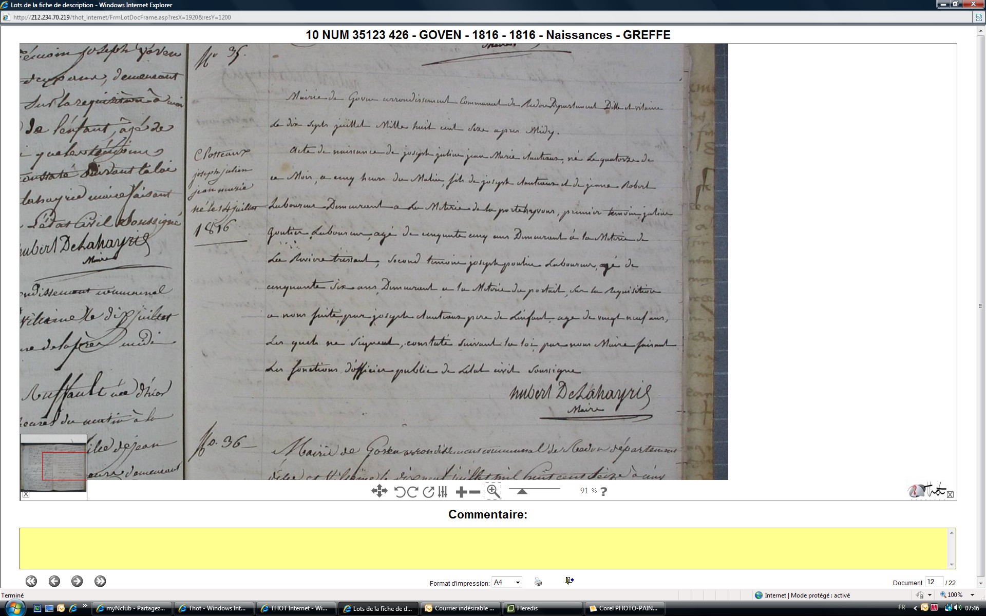 Naissance : 14 janvier 1816 à Goven 35580 Métairie de la Porte Yvon