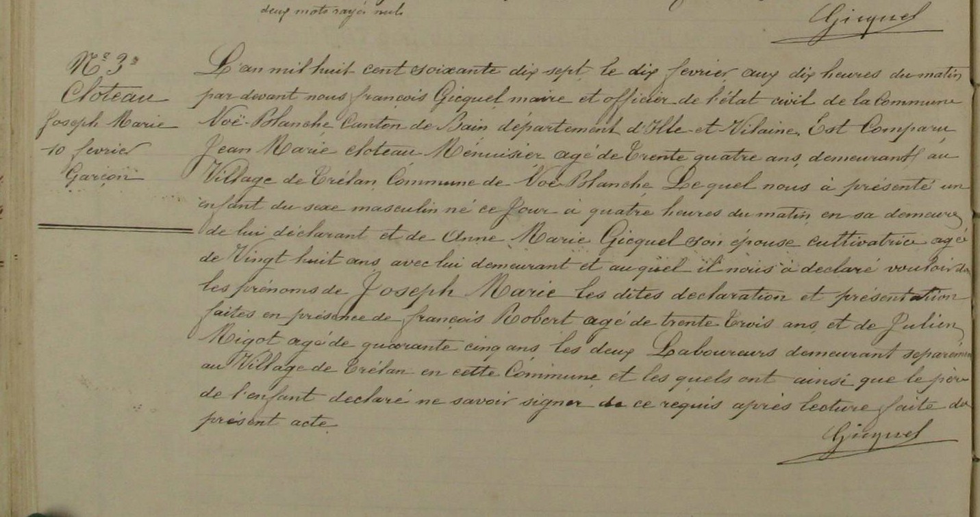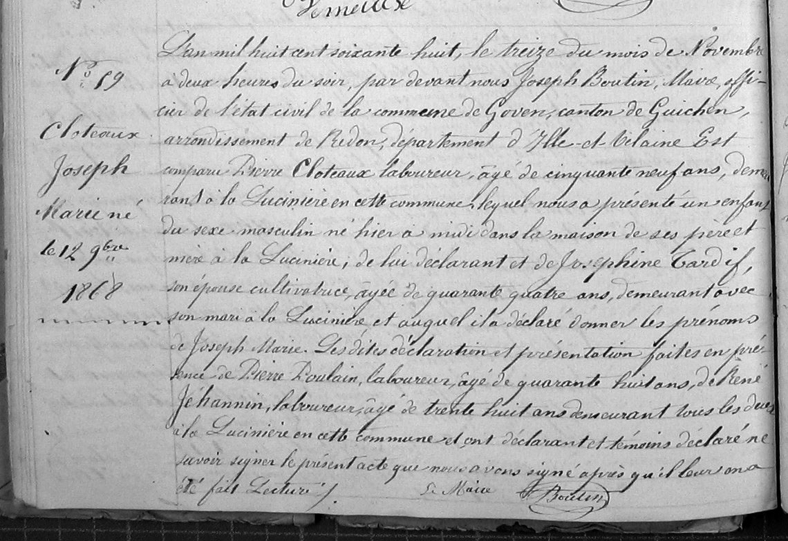 Naissance : 12 novembre 1868 à Goven 35580 La Lucinière