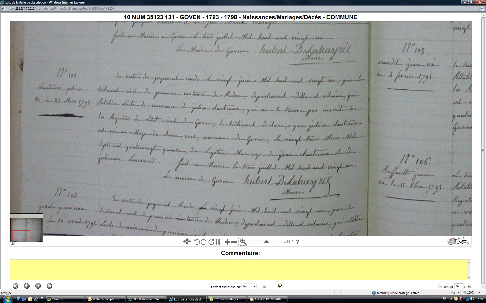 Naissance : 7 prairial an IV à Goven 35580 Cucuère