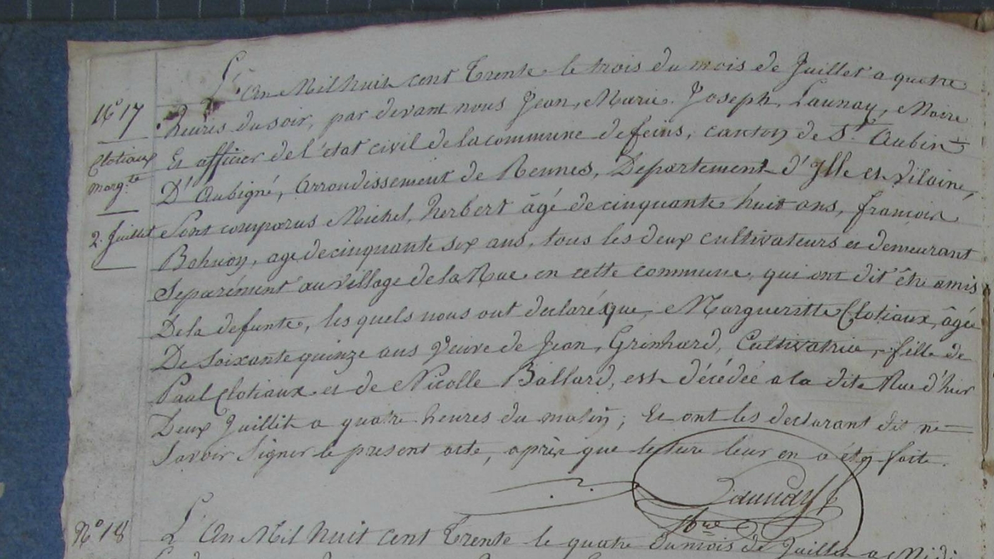 domiciliée à Rennes Toussaint en 1784Décès : 2 juillet 1830 à Feins 35440