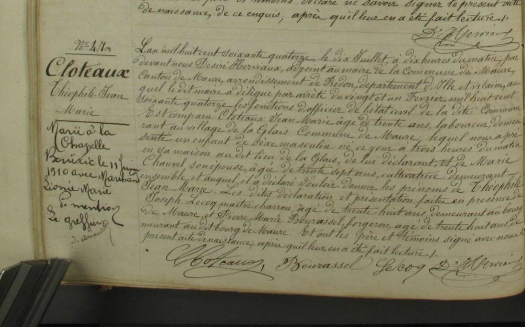 Naissance : 10 juillet 1874 à Maure-De-Bretagne 35330