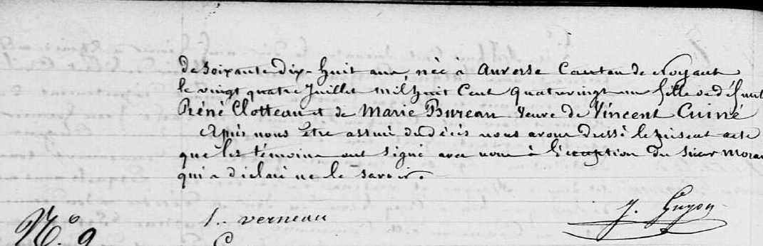 Marié le 9 août 1812, noyant, avec anne CLOTEAU , née le 24 juillet 1781 - Auverse (49), décédée (parents : Evenement_Union_CUINET_Vincent_CLOTTEAU_Anne_Mariage_162089_3.jpgrené CLOTEAU †1788 & Evenement_Union_CUINET_Vincent_CLOTTEAU_Anne_Mariage_162089_4.jpgmarie BUREAU 1739-1787) , dont