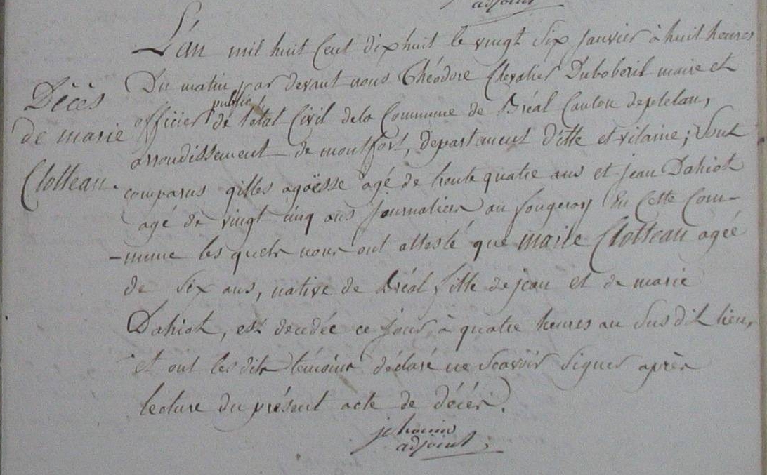 Naissance : calculée 1812 à Bréal-Sous-Montfort 35310 Décès : 26 janvier 1818 à Bréal-Sous-Montfort 35310