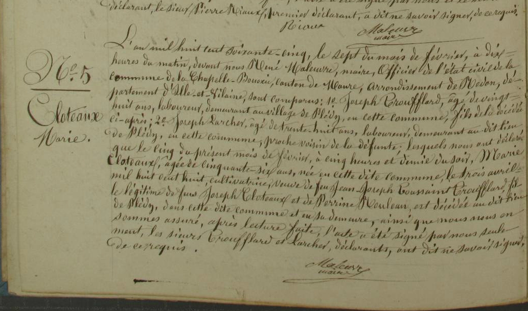 Décès : 5 février 1865 à La Chapelle-Bouëxic 35330 Plédin