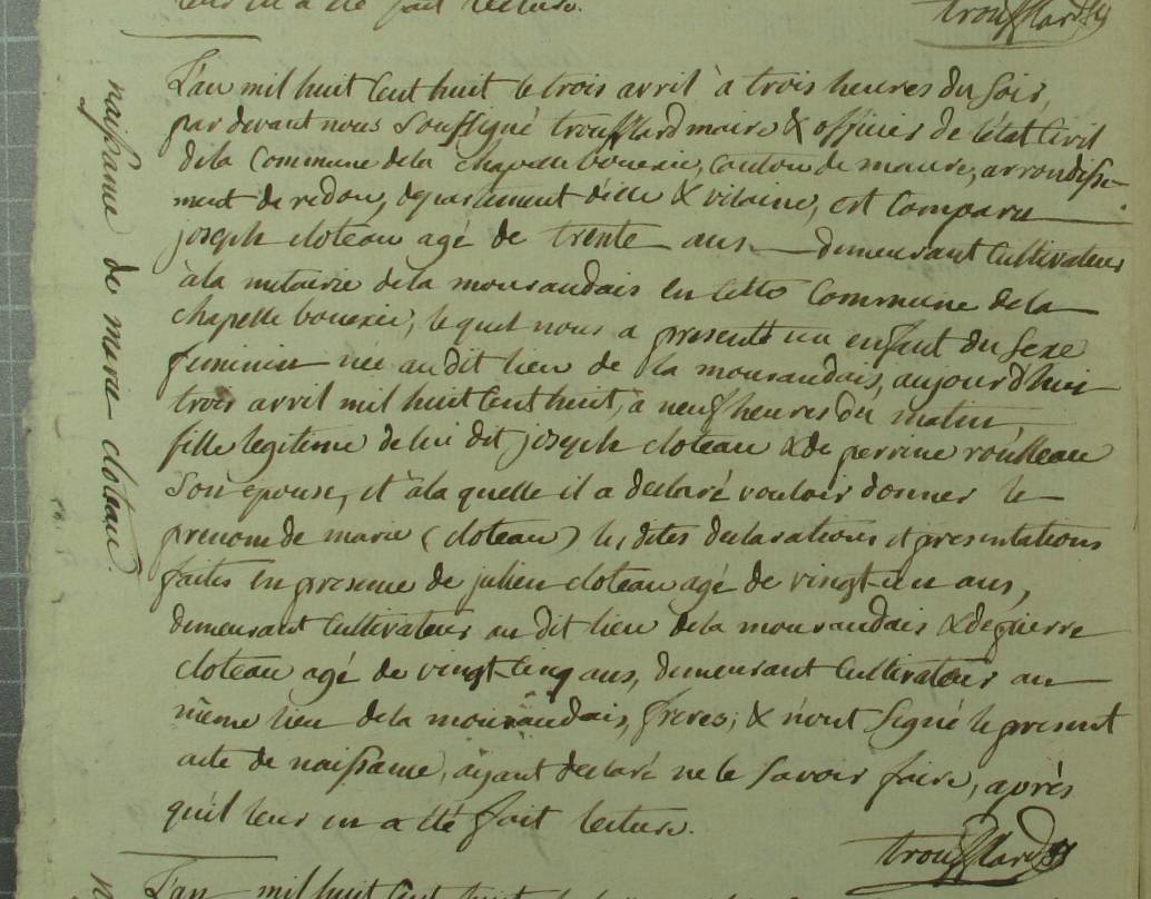 Naissance : 3 avril 1808 à La Chapelle-Bouëxic 35330