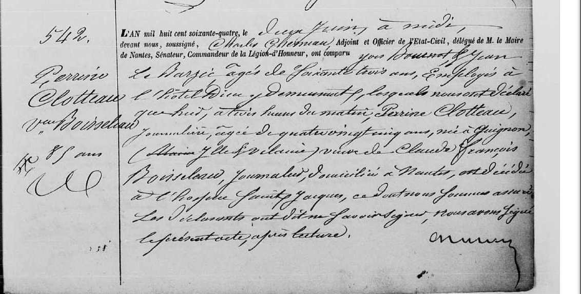 Naissance : calculée 1779 à Guignen 35580 Décès : 1er juin 1864 à Nantes 44000 hôpital Saint Jacques
