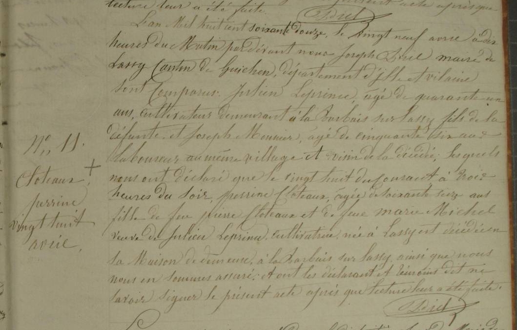 Naissance : 7 pluviôse an VII à Lassy 35580 La Poulnais Décès : 29 avril 1872 à Lassy 35580 La Barbais