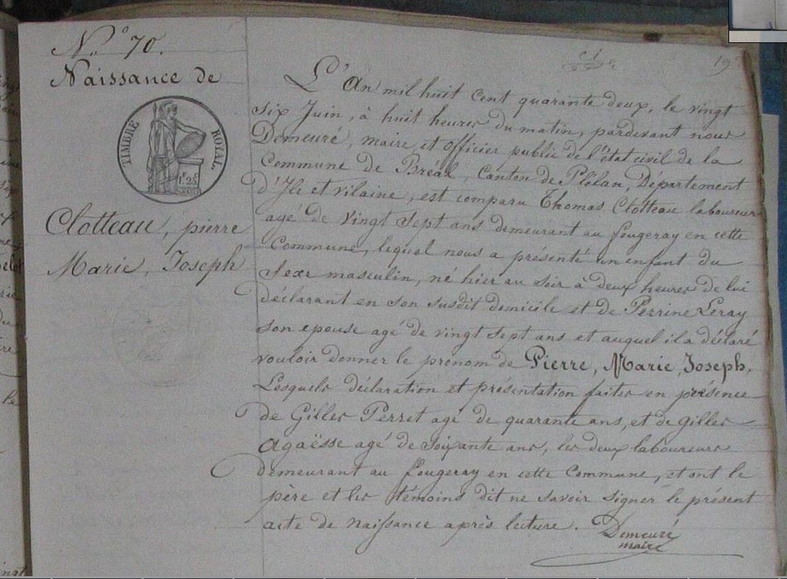 Naissance : 26 juin 1842 à Bréal-Sous-Montfort 35310