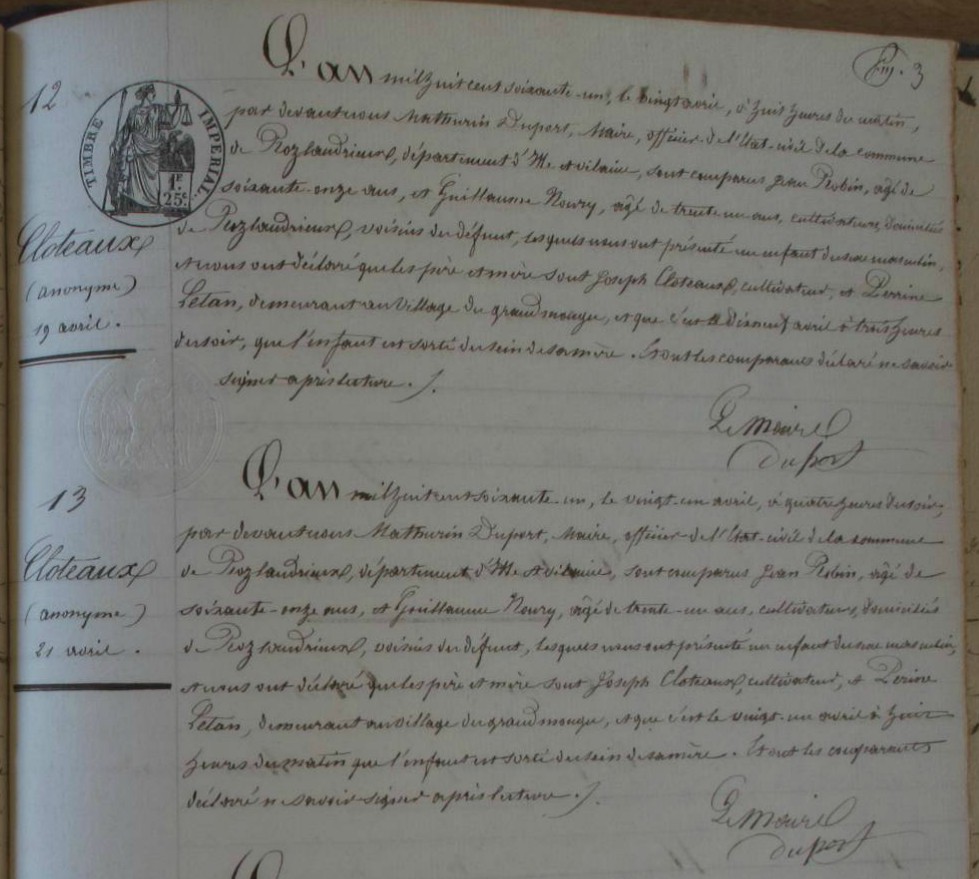 Naissance : 11 avril 1825 à La Chapelle-Bouëxic 35330 Décès : 11 avril 1825 à La Chapelle-Bouëxic 35330