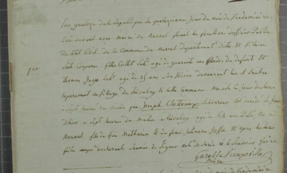 Naissance : calculée 1737 à Mernel 35330 Décès : 14 vendémiaire an XIV à Mernel 35330