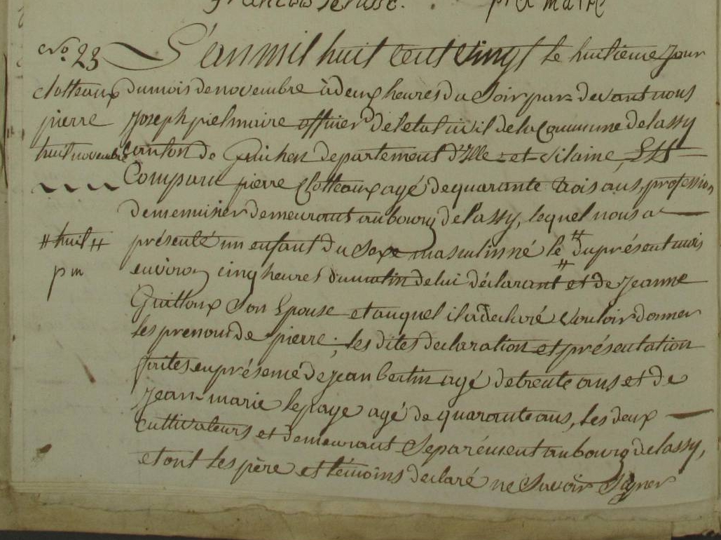 Joseph Hignet âgé de 41 ans étant né à la Gommerais en cette commune le 20 décembre 1818 suivant son acte de naissance de la dite commune de la Chapelle Bouëxic laboureur domicilié de la dite commune de la Chapelle Bouëxic y demeurant au dit lieu de Gommerais majeur fis de Joseph Hignet décédé laboureur au dit lieu de Gommerais en cette commune le 31 août 1854 suivant les registres de décès de notre commune de la Chapelle Bouëxic et de feue Perrine Leray décédée cultivatrice au dit lieu de la Gommerais en cette commune de le Chapelle Bouëxic le 11 mai 1826 suivant le registre des décès de la même commune de la Chapelle Bouëxic d'une part et Marie Corvoisier âgée de 40 ans étant née au village de Pichais en cette commune le 8 janvier 1820 suivant le registre des naissances de cette commune de la Chapelle Bouëxic et demeurant au village de Guichardais cultivatrice et domiciliée de la dite commune de la Chapelle Bouëxic majeure fille de Pierre Corvoisier âgé de 68 ans (1792) laboureur domicilié du dit lieu de la Guichardais en cette commune présent et consentant et de Jeanne Ollivier aussi âgée de 68 ans (1792) cultivatrice domiciliée au dit lieu de la Guichardais en cette commune ici présente et consentante d'autre part ... acte en présence de Pierre Marie Rouxel âgé de 21 ans marchand et Antoine Mazargeuil âgé de 37 ans marchand les domicilié du bourg, de Pierre Clotteaux âgé de 54 ans et de Jean Joseph Clotteaux âgé de 38 ans les deux laboureurs domiciliés au Mariage et les quatre en cette dite commune et tant le nouvel époux, la nouvelle épouse, le père et la mère de la nouvelle épouse ainsi que les deux derniers témoins dit ne avoir signer. -