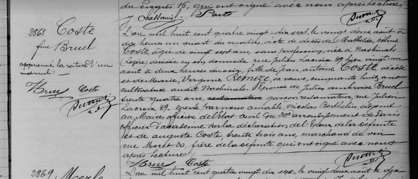 Naissance : calculée 1870 Décès : 21 août 1897 à Paris 20ème 75120