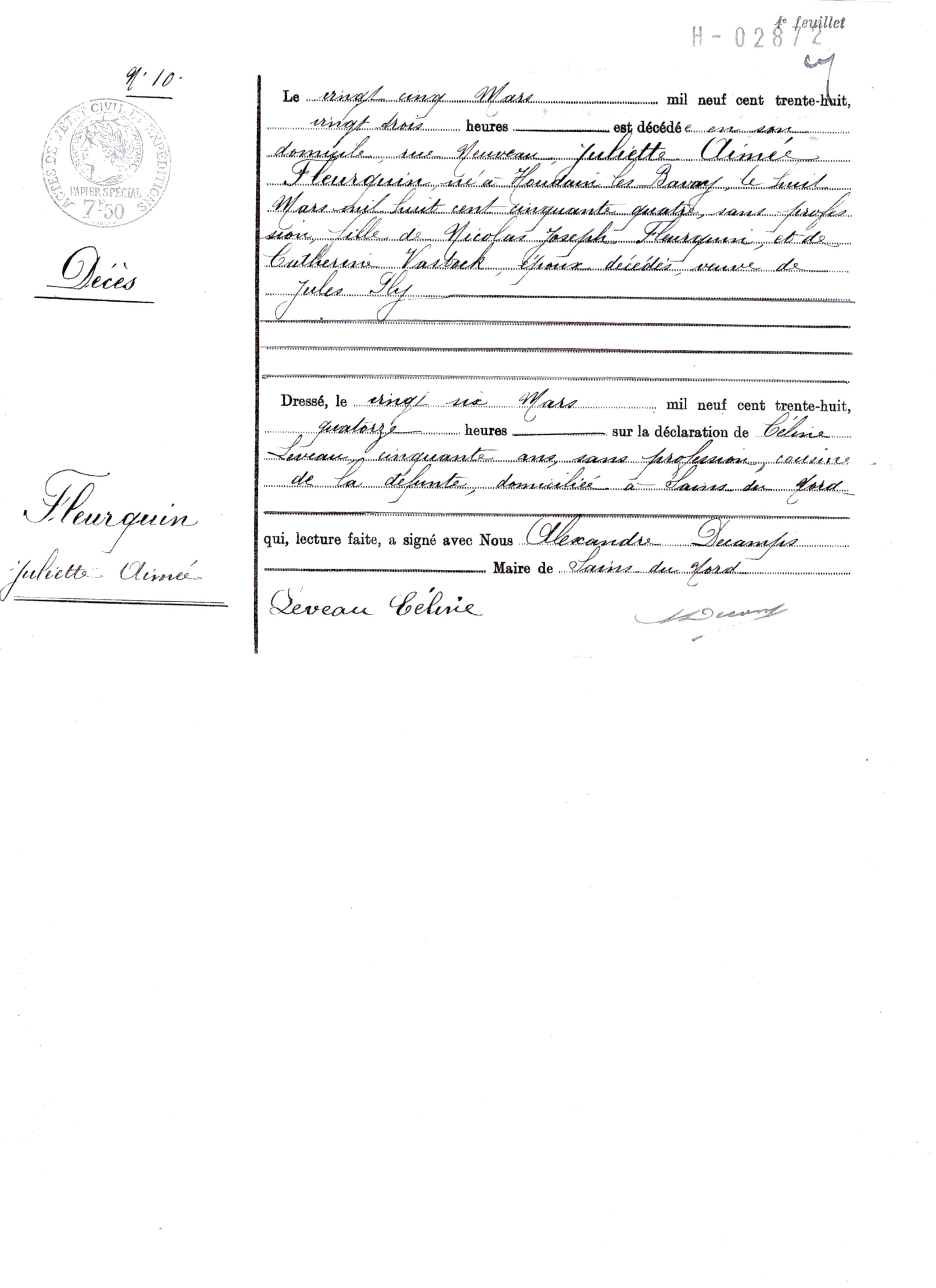 En vie : 20 octobre 1929 à Sains-Du-Nord 59177 Décès : 25 mars 1938 à Sains-Du-Nord 59177 en son domicile Rue Neveau