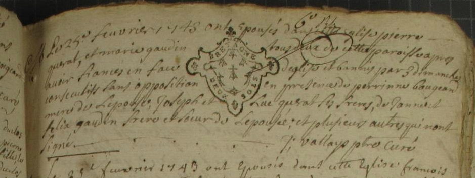 Mariée le 25 février 1743, Guichen, Ille et Vilaine, avec Pierre Querat ca 1720-1796, dont