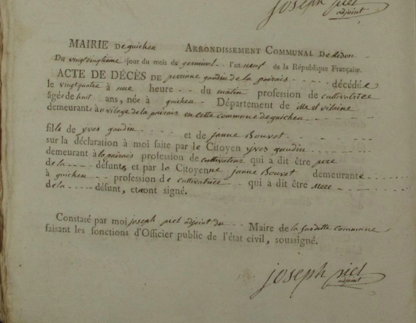 Naissance : calculée 1793 à Guichen 35580 Décès : 25 germinal an IX à Guichen 35580 La Pairais