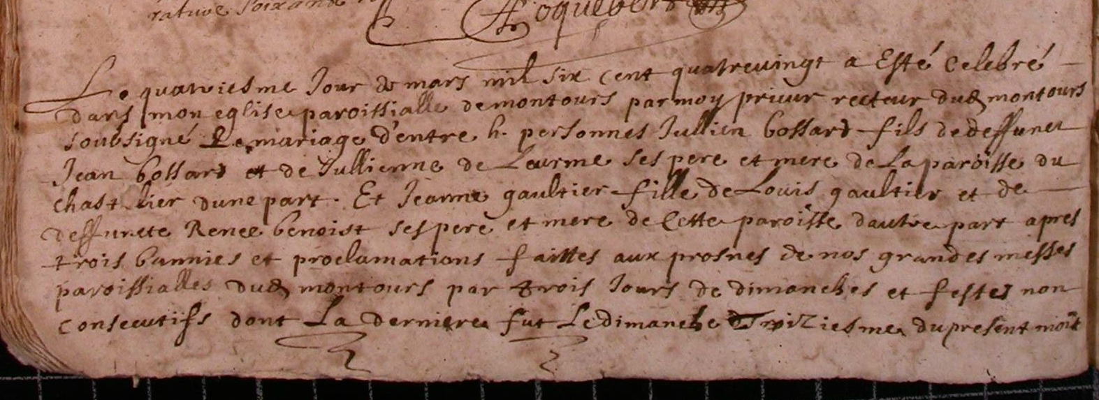 BOSSARD Julien, de Jean + et Julienne DELEURME, (Le Chatellier), x GAULTIER Jeanne, de Louis et Renée BENOIST +, #04 03 1680