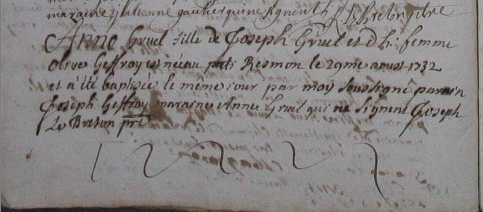 décrétée fait par Bréal à cause du rachat?Marraine : 29 août 1732 à Bréal-Sous-Montfort 35310