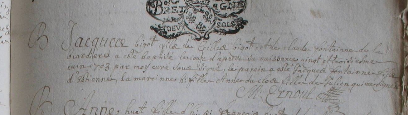 Naissance : 22 juin 1703 à Bazouges-La-Pérouse 35560 Baptême : 23 juin 1703 à Bazouges-La-Pérouse 35560