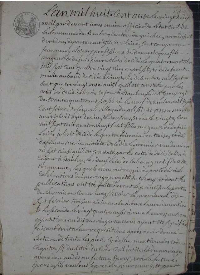 Naissance : avant 1770 Décès : 4 frimaire an XIII à Baulon 35580