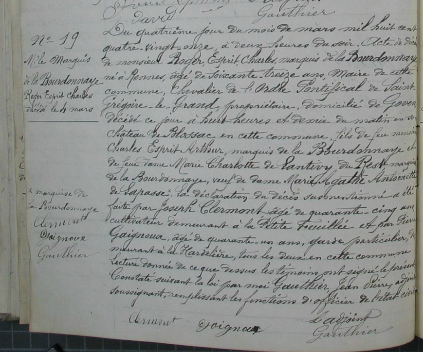 Naissance : calculée 1818 à Rennes 35000 Décès : 4 mars 1891 à Bazouges-La-Pérouse 35560 Chateau de Blossac