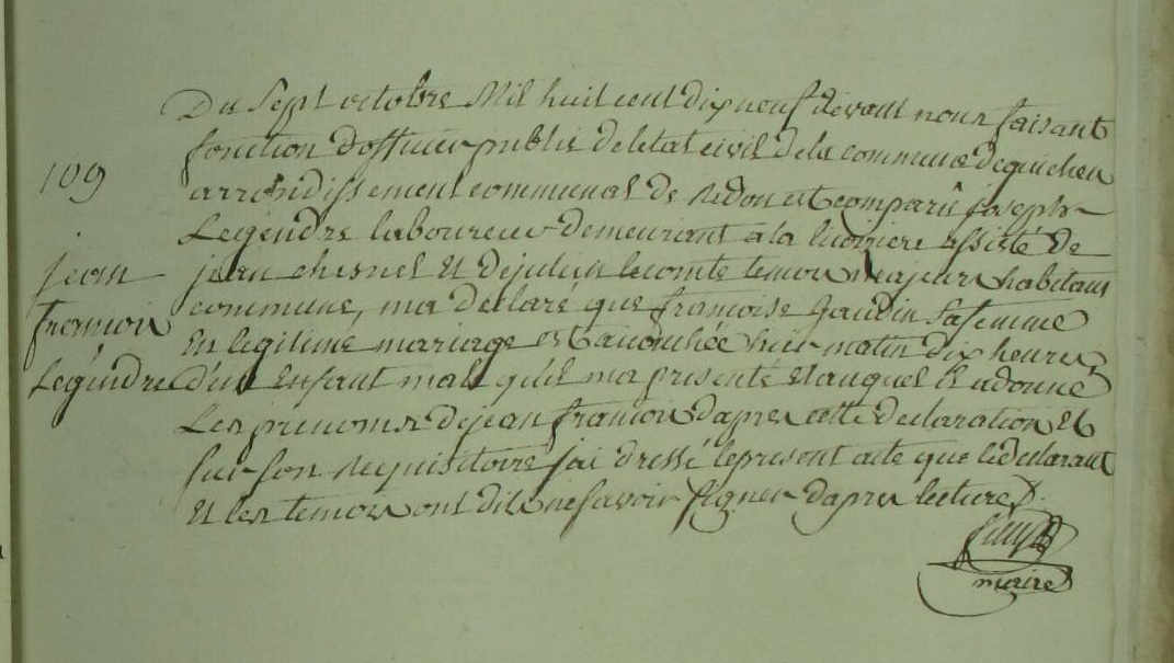 mariage sous le nom LEGENDRE Jean-François et POTHIER Marguerite Jeanne Marie