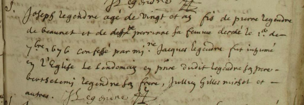 mineur à son mariage, il signe JoLegendreIIIIIbarrésInhumation : après 25 novembre 1682