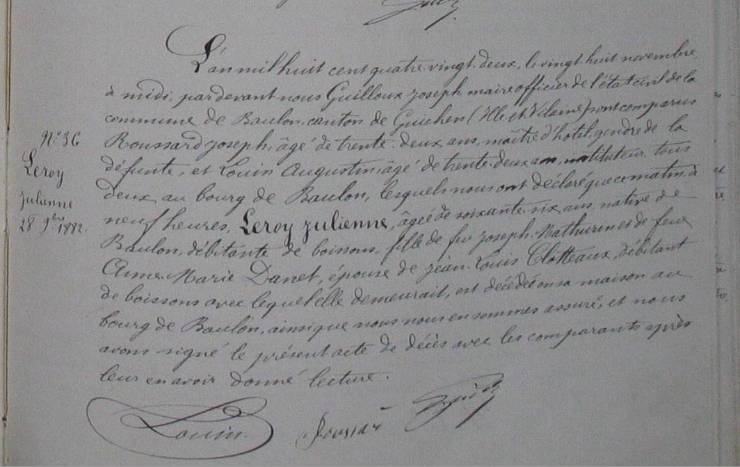 Décès : 28 novembre 1882 à Baulon 35580 Bourg