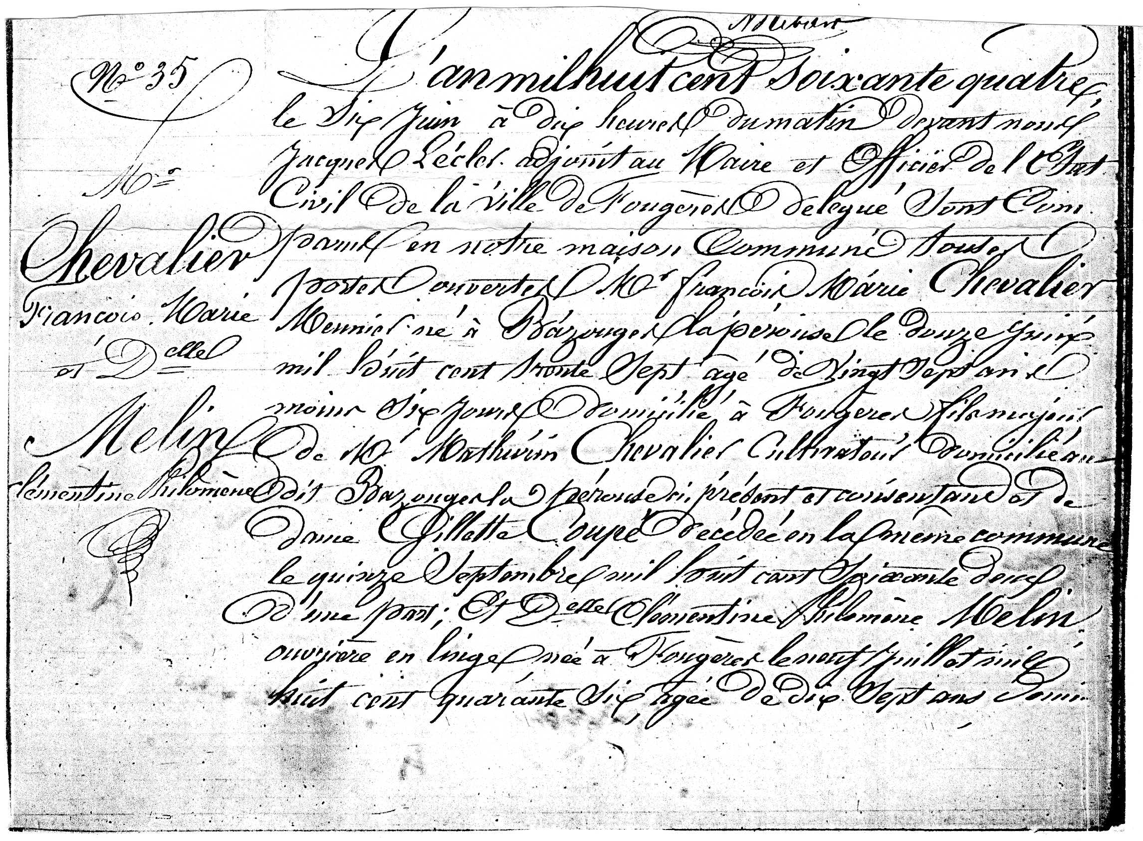 Nom epoux: CHEVALIER / Nom epouse: MELIN Clémentine Philomène/ An: 1864 /