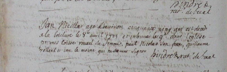 présent à son décès Pierre et Guillaume NICOLASDécès : 11 avril 1681 à Bréal-Sous-Montfort 35310