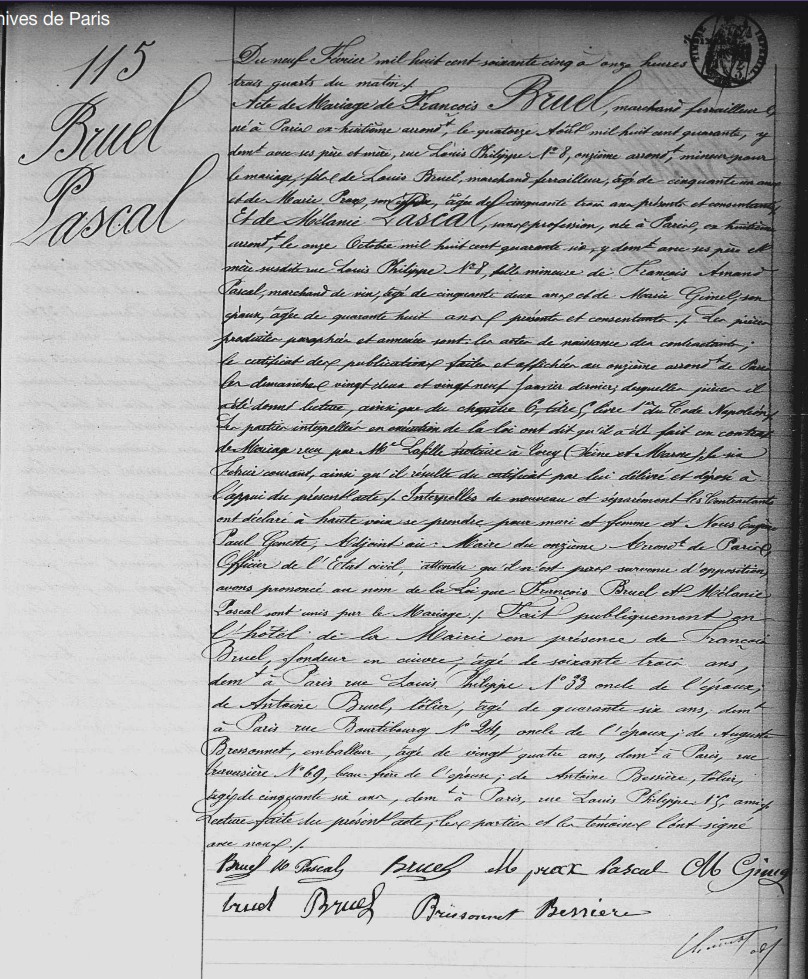 Mariage : 9 février 1865 à Paris 11ème 75111 Mairie Popincourt