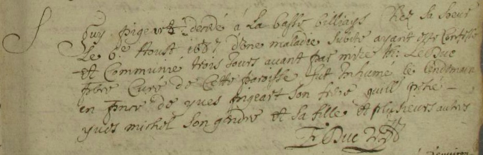 Décès : 6 juin 1678 à Guichen 35580 village de la Basse Billiais Inhumation : 7 juin 1678 à Guichen 35580 Eglise
