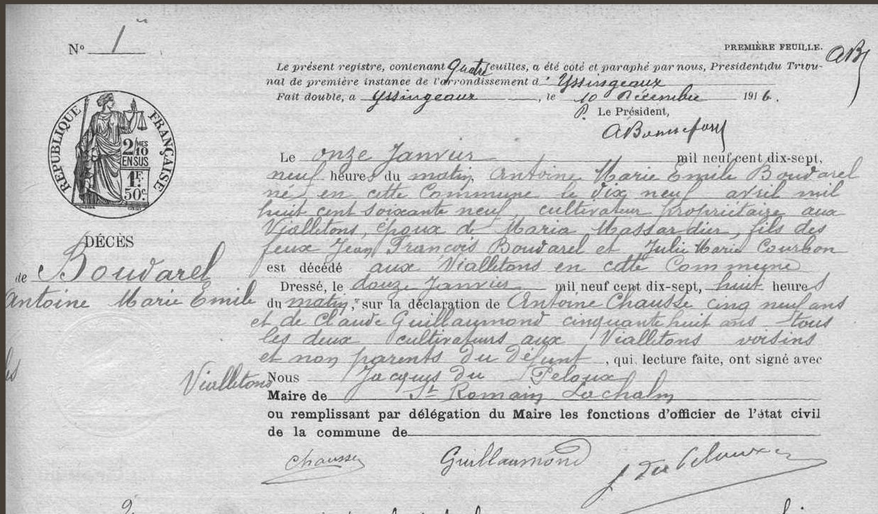 Naissance : 19 avril 1869 à Saint-Romain-Lachalm 43620 Les Vialletons Décès : 11 janvier 1917 à Saint-Romain-Lachalm 43620 Vialletons