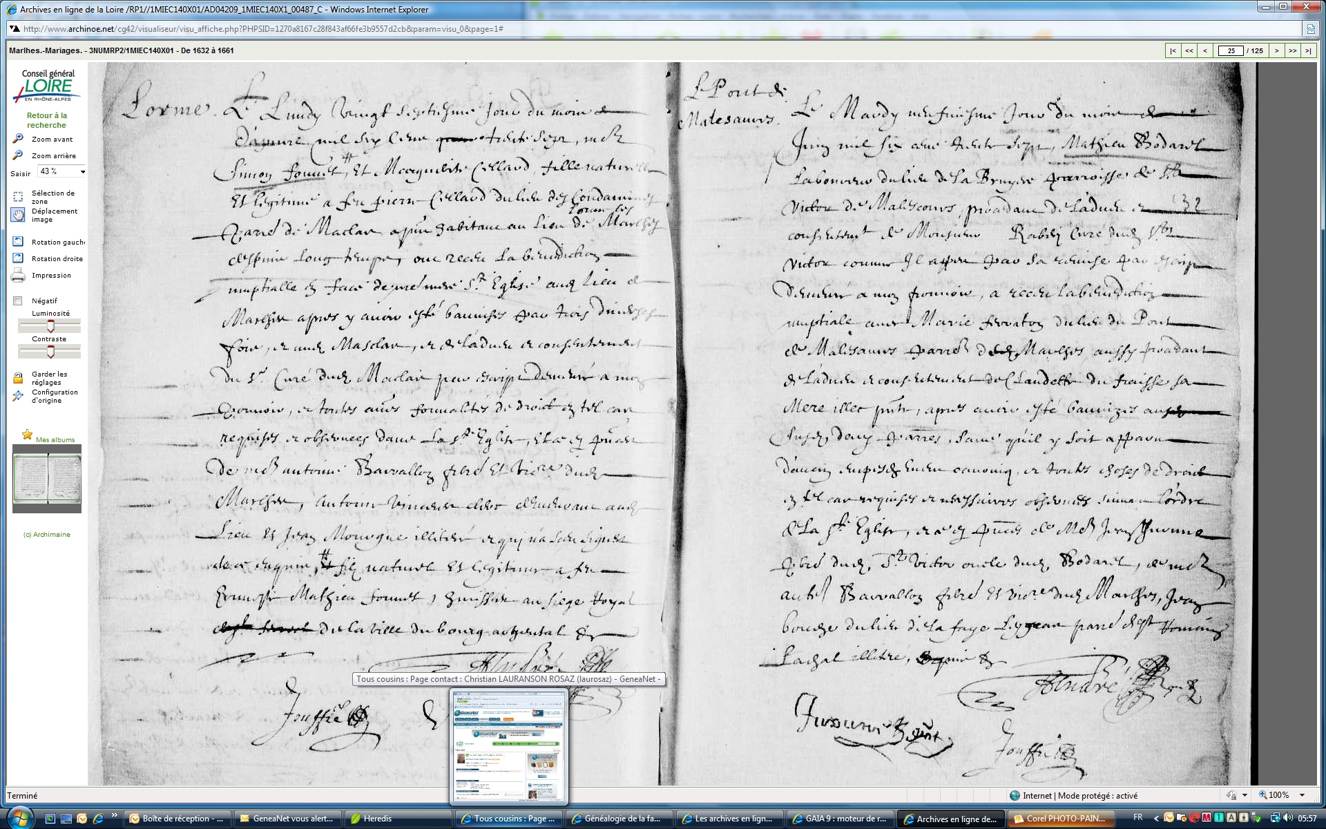 Le mardi 9 juin 1637, Mathieu BODAREL laboureur du lieu de la Bruyère paroisse de St Victor de Malescours ... a reçu la bénédiction nuptaile avec Marie FERRATON du lieu du Pont de Malesaures, paroisse de Marlhes, de l'avis et consentement de Claudette DU FRAISSE sa mère ... en présence de Jean JURINE prêtre dudit St Victor oncle dudit BODAREL, de ? BARRALLON vicaire de Marlhes, de Jean BONCHE, de la Faye Leygras paroisse de St Romain Lachal.