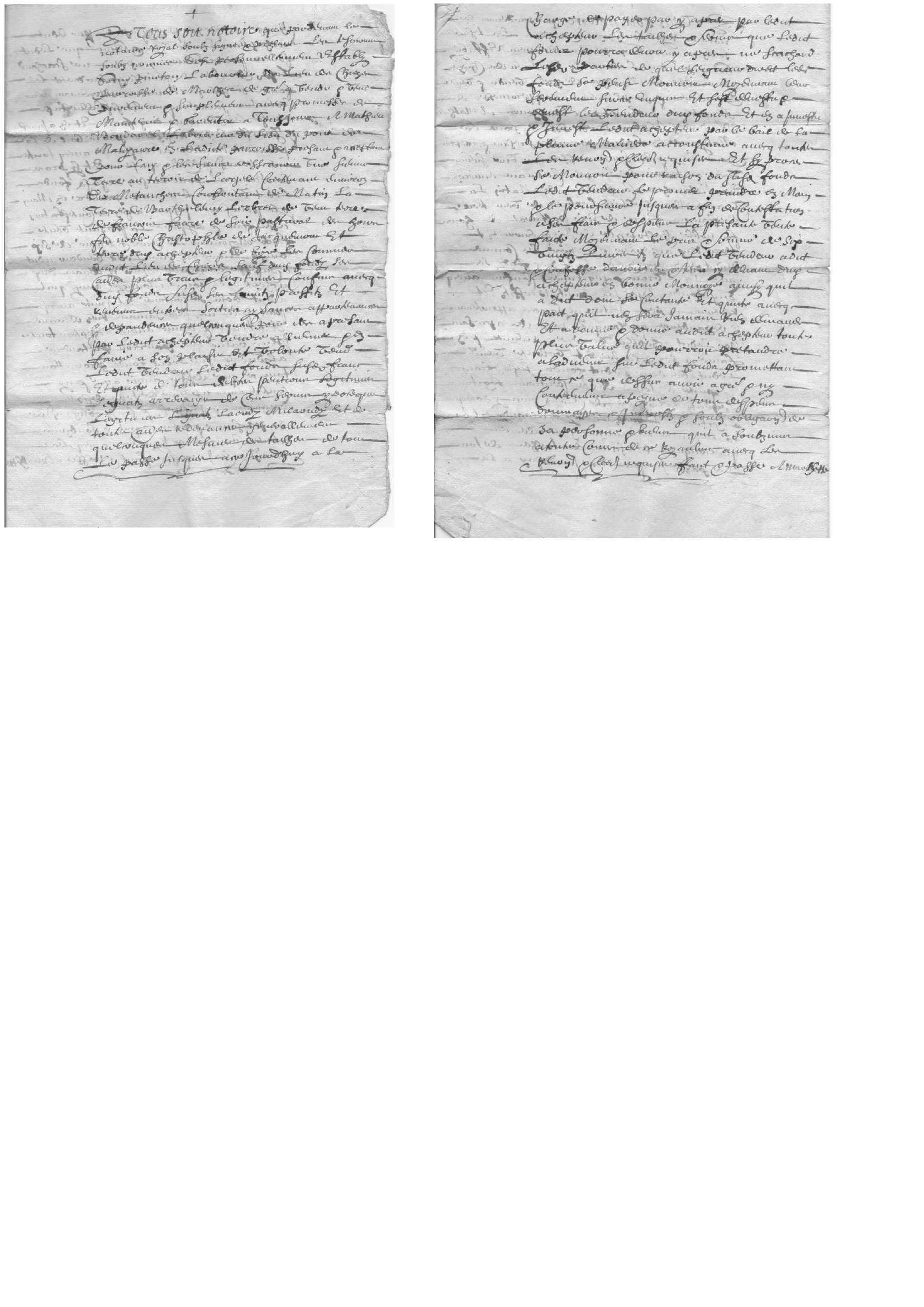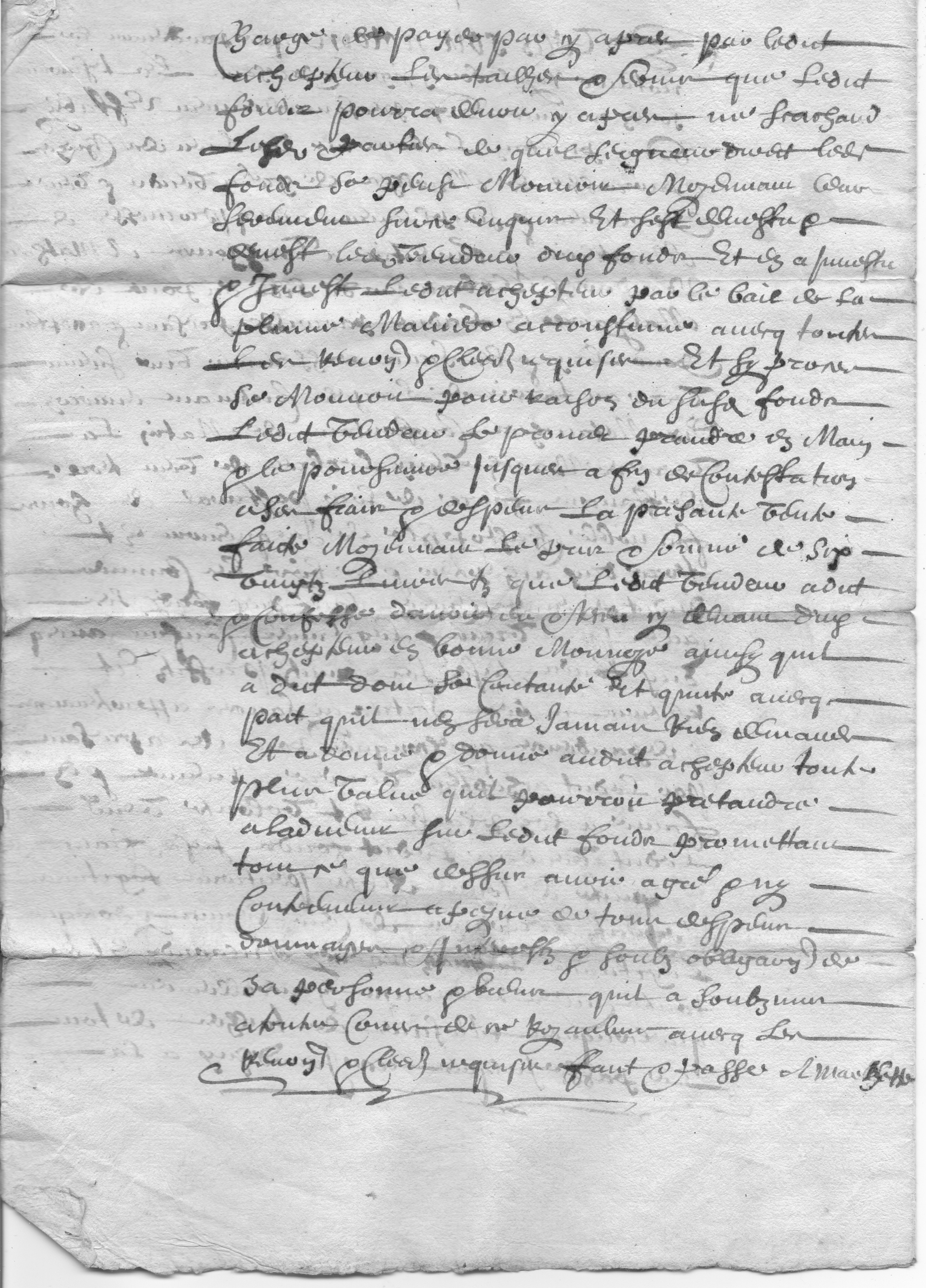 « Lan mil six cens soixante dix et le douzième jour du mois d'avril apres midy, s'est estably en sa personne claude bachellard laboureur du lieu de montaront parroisse de marlhes, lequel de gré a cognu et confessé avoir recu comme il a réellement recu oultre aultre quictance de mathieu boudarel tisserand du lieu des viallettons, et claude royon laboureur son gendre demeurant au pont de malezaures, letout dans ladicte paroisse de marlhes presens et ... la somme de cent livres sur et en deduction de la constitution dotalle faicte par lesdictz boudarel et royon a françoise boudarel en son contract de mariage passé avec ledict estably, ainsy que les parties ont dict, dont et delaquelle somme de cent livres payée par moitié par lesdicts boudarel et royon, icelluy estably s'est bien et ... contenté et en a quittés et quittes lesdictz boudarel et royon et tous aultres ... part de n'en faire demande a ladvenir a peyne de tous despens, dommages et interests, sans préjudice du surplus de la dite constitution, par ses foy et serments, et toutes obligations, soubmissions, renonciations et autres clauses requises, fait et passé audit lieu de marlhes, maison du notaire royal soubsigné,