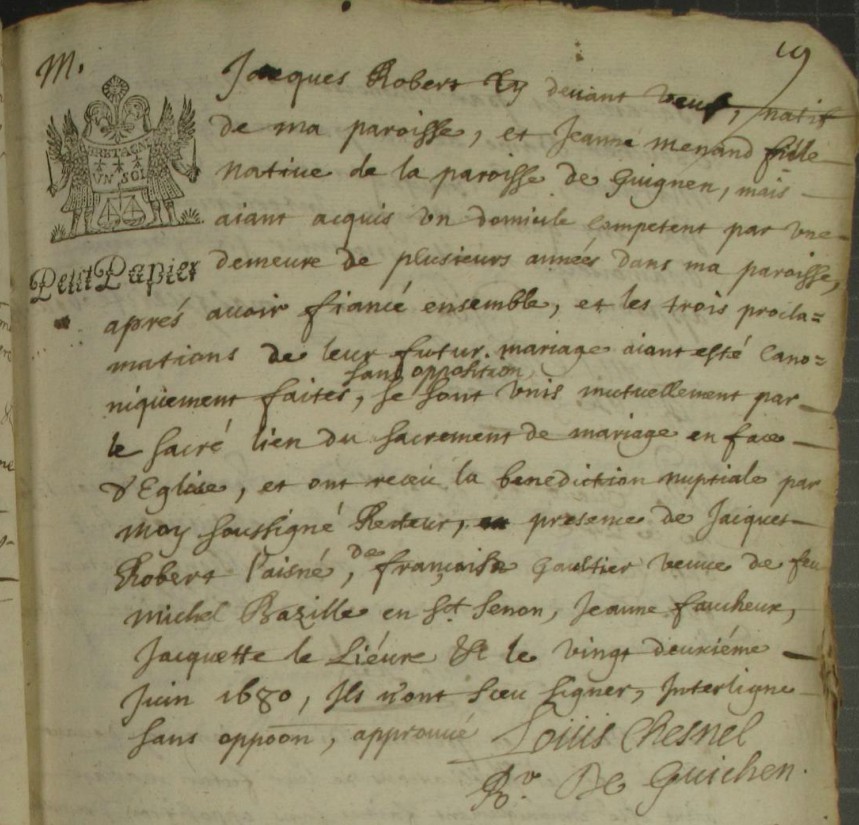 Mariage religieux : 22 juin 1680 à Guichen 35580