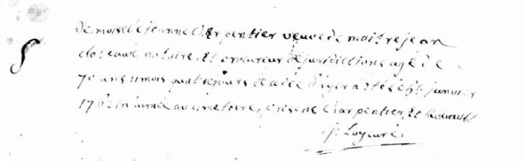 si présent en 1658 au mariage de Pierre JUBAUD et Michelle THEBAUD : il signe Jancharpentier griffouilliDécès : 16 janvier 1672 à Goven 35580