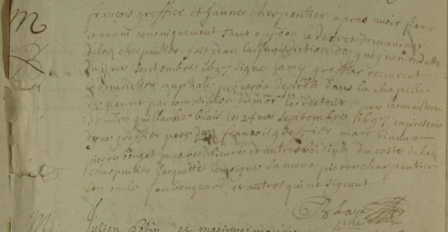 Mariage religieux : 24 septembre 1697 à Guichen 35580 Chapelle de Glanret