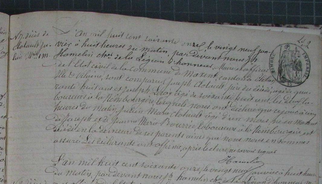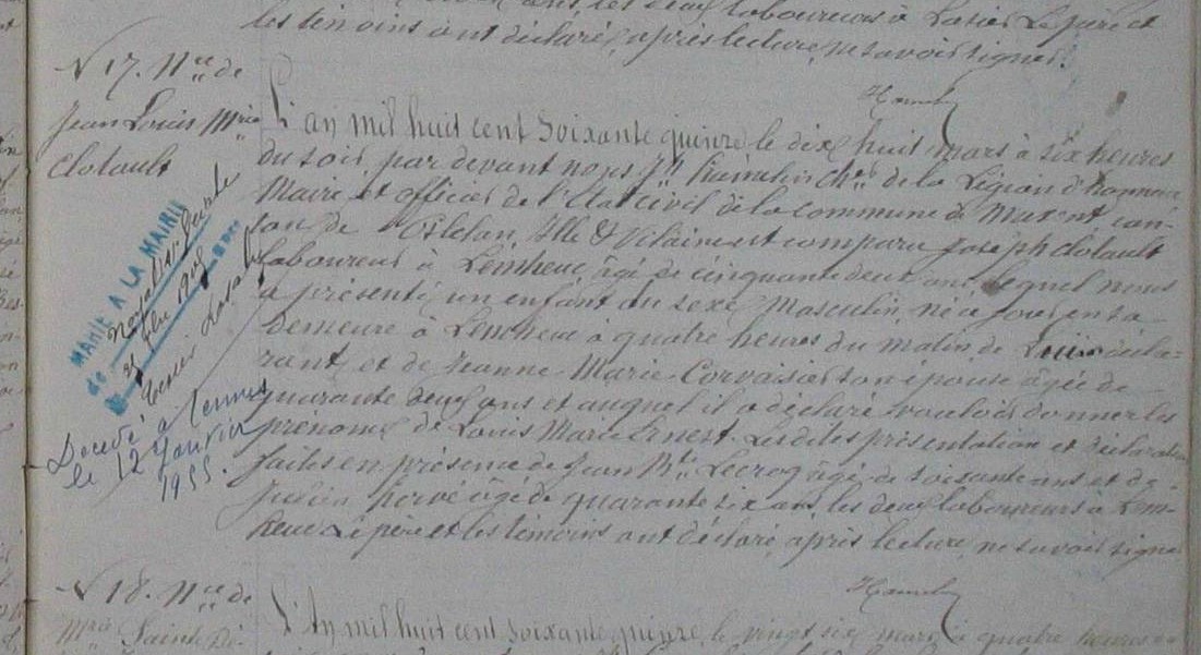 Naissance : 21 février 1821 à Maxent 35380 Décès : 20 novembre 1896 à Maxent 35380